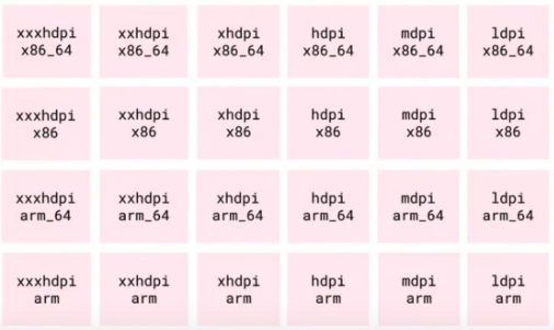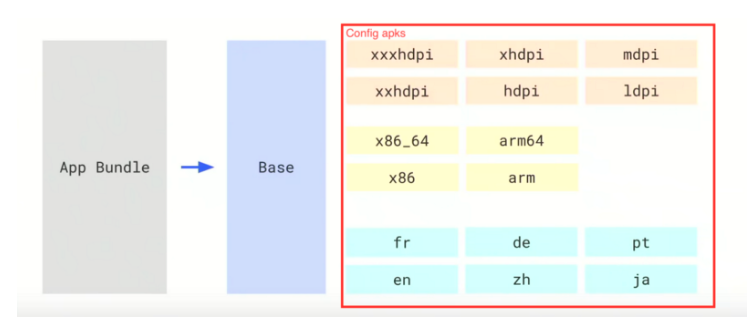 Configuration apk: Mỗi APK trong số này bao gồm native libraries và resource cho từng cấu hình device cụ thể, nó sẽ tối ưu hóa nội dung APK theo dựa theo :