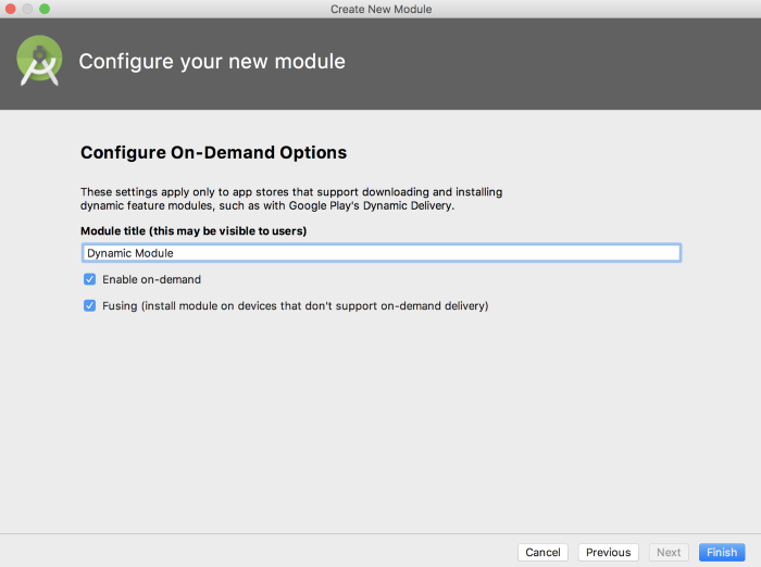 - Enable on-demand: có cho phép down module ở lần đầu tiên cài app hay không. Nếu không thì khi nào người dùng request thì mới down xuống