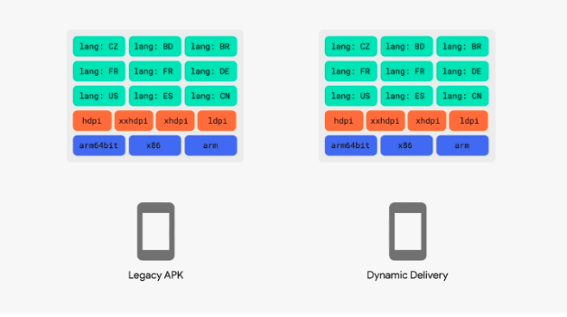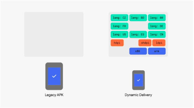Dynamic Delivery: chỉ tải code và resource người dùng cần cho app của họ, dùng app bundle để gen các file apk cho mỗi cấu hình của thiết bị sử dụng. Ví dụ nếu Tiếng Anh là ngôn ngữ chính thì sẽ không cần các ngôn ngữ khác