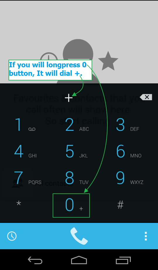 Sử dụng Dialler app mặc định trên thiết bị Android để thực hiện thao tác nhấn giữ phím "0" để hiển thị kí tự "+".