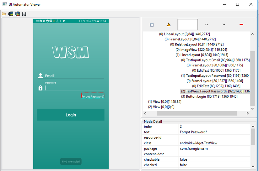 Màn hình Login app WSM trên công cụ UI Automator Viewer