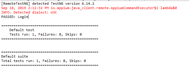 Kết quả test được hiển thị trên Console như sau, TCs Login vừa chạy đã PASSED.