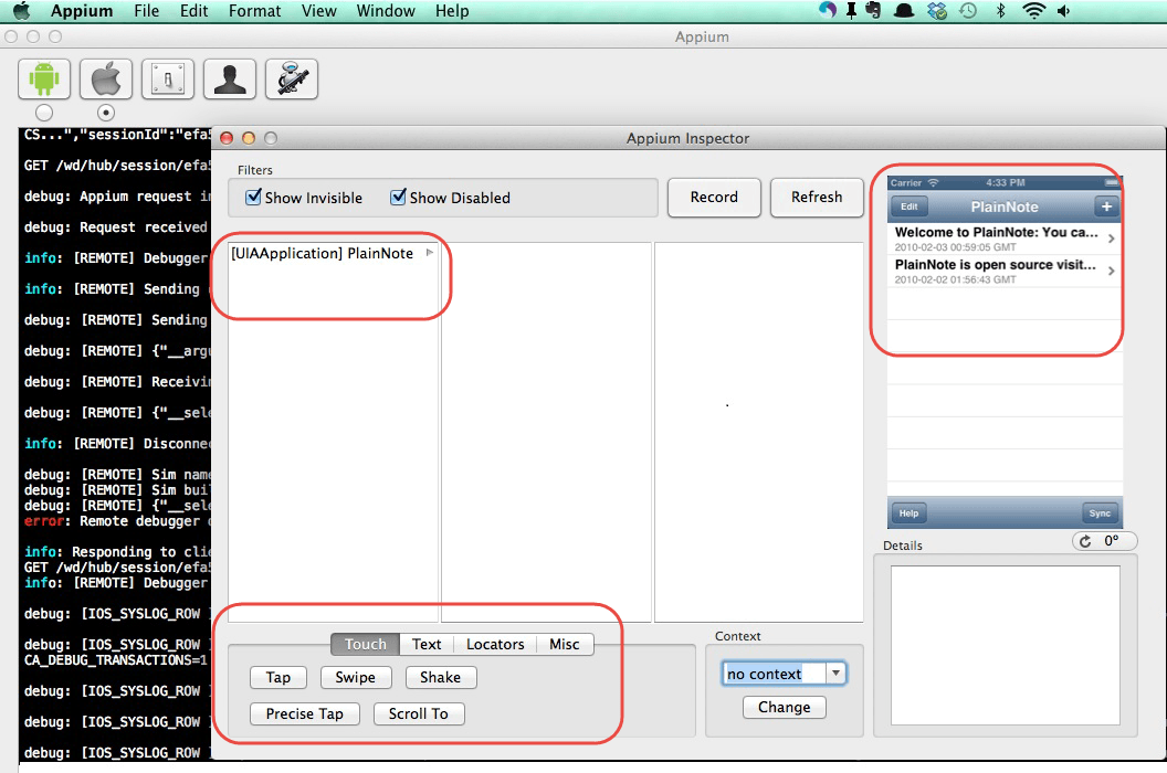 Tương tự như công cụ ghi và phát lại Selenium IDE, Appium có 'Inspector' để ghi và phát lại. Nó ghi lại và phát hành vi ứng dụng gốc bằng cách kiểm tra DOM và tạo các tập lệnh thử nghiệm bằng bất kỳ ngôn ngữ nào bạn muốn. Tuy nhiên, hiện tại, không có hỗ trợ cho Thanh tra Appium cho Microsoft Windows. Trong Windows, nó khởi chạy Appium Server nhưng không kiểm tra các phần tử. Tuy nhiên, trình xem UIAutomator có thể được sử dụng như một tùy chọn để Kiểm tra các phần tử.