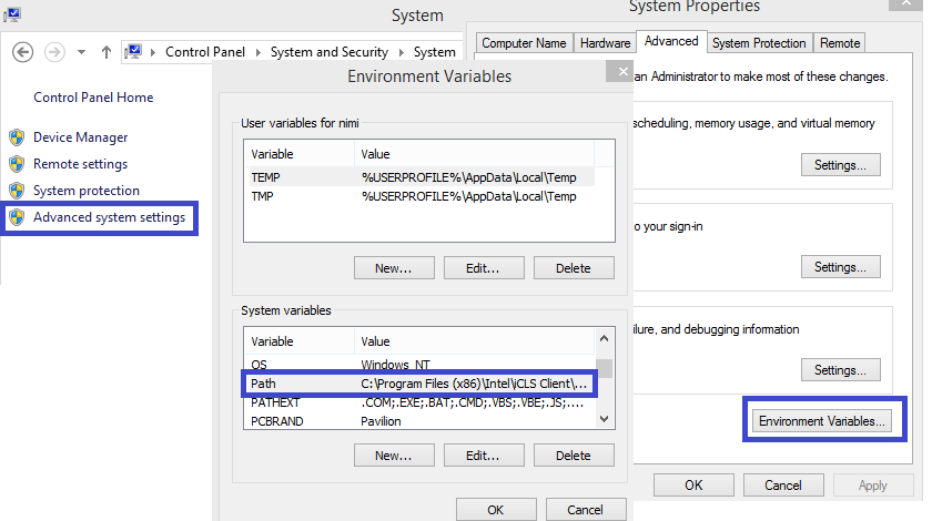 Chuyển đến Bảng điều khiển >> Hệ thống và Bảo mật >> Hệ thống và từ bảng điều khiển bên trái, nhấp vào Settings Cài đặt hệ thống nâng cao '. Từ 'Thuộc tính hệ thống' bật lên, nhấp vào tab 'Nâng cao' và sau đó nhấp vào nút "Biến môi trường".