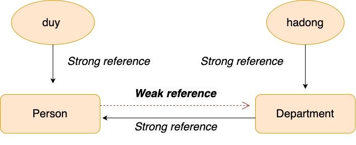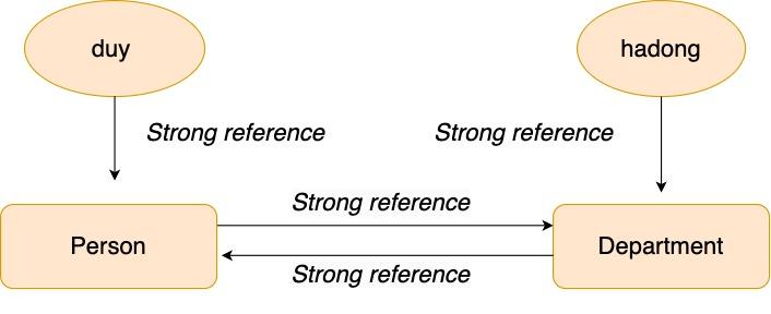 - Khi đó Person và Departmen, mỗi thứ sẽ có 2 strong refernce trỏ đến. Vì vậy, khi bạn chỉ set tuan = nil và gotham = nil thì Person và Departmen vẫn sẽ không được xóa khỏi bộ nhớ dù không cần dùng đến nữa.