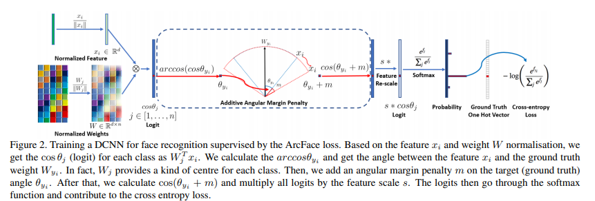 Hàm mất mát Additive Angular Margin Loss có thể được xem như một sự cải tiến cho hàm softmax, tích vô hướng giữa véc tơ đặc điểm từ mô hình DCNN và lớp fullly connected cuối bằng với khoảng cách cosine của feature và weight đã được chuẩn hóa. Chúng ta tận dụng hàm arc-cosine để tính góc giữa feature hiện tại và weight mục tiêu . Sau đó chúng ta cộng thêm additive angular margin vào góc mục tiêu và chúng ta sẽ thu được lại véc tơ logit thông qua hàm cosine. Tiếp theo, các logits sẽ được định lại tỉ lệ và các bước còn lại sẽ giống hệt như hàm mất mát softmax. Ảnh dưới đây minh họa quá trình vừa đề cập: