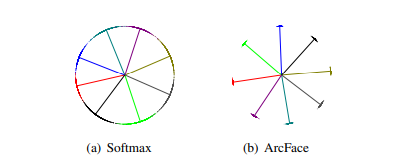 Theo như hình, ta có thể thấy việc sử dụng softmax với hàm mất mát entropy chéo giúp chúng ta phân tách các véc tơ đặc điểm tuy nhiên lại tạo nên 1 sự mơ hồ rõ ràng trên đường ranh giới quyết định (decision boudaries). Trong khi đó, sử dụng softamx với hàm mất mát ArcFace lại có sự phân chia rõ rệt giữa các lớp gần nhau.