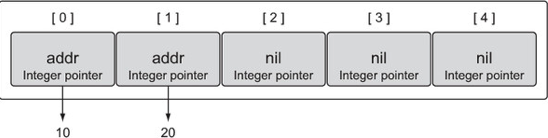 // Khai báo một mảng con trỏ integer có 5 phần tử.
