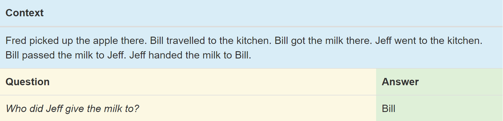 Lý do mình thử trên tập dataset này là bởi tất cả các câu hỏi trong tập dữ liệu sẽ đều được cung cấp tương ứng với những thông tin ngữ cảnh (context information) có chứa câu trả lời. Ngoài ra, Đây cũng là một tập dữ liệu tương đối lớn, được chia cụ thể ra thành 20 vấn đề cụ thể (tasks) của bài toán trả lời câu hỏi. Trong bài này chúng ta sẽ sử dụng task số 5 - Một task mà mỗi ngữ cảnh sẽ có thông tin về những hành động của 3 chủ thể (Three Argument Relations). Một trong những ví dụ về task #5 chính là ở bức ảnh mình để ngay trên đầu bài viết này.