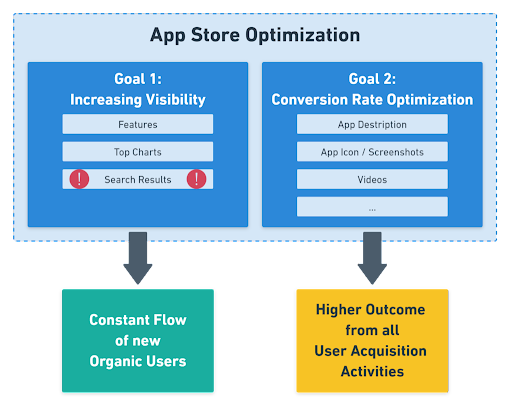 Ở 1 phương diện khác, App Store Optimization (ASO) là cách thức tăng mức độ hiển thị của ứng dụng trên App Store và Google Play Store. Điều này rất quan trọng trong hành trình của người dùng. Vì ngay cả khi ứng dụng đã có một chiến dịch quảng cáo tốt và đưa được lượng lớn người dùng tiềm năng đến App Store, thì trang cửa hàng ứng dụng phải thật sự hấp dẫn nhằm thuyết phục người dùng hoàn tất việc cài đặt. Hay hiểu cách khác, ASO còn góp phần tăng lượng người dùng organic mà không tốn bất kỳ chi phí quảng cáo nào.