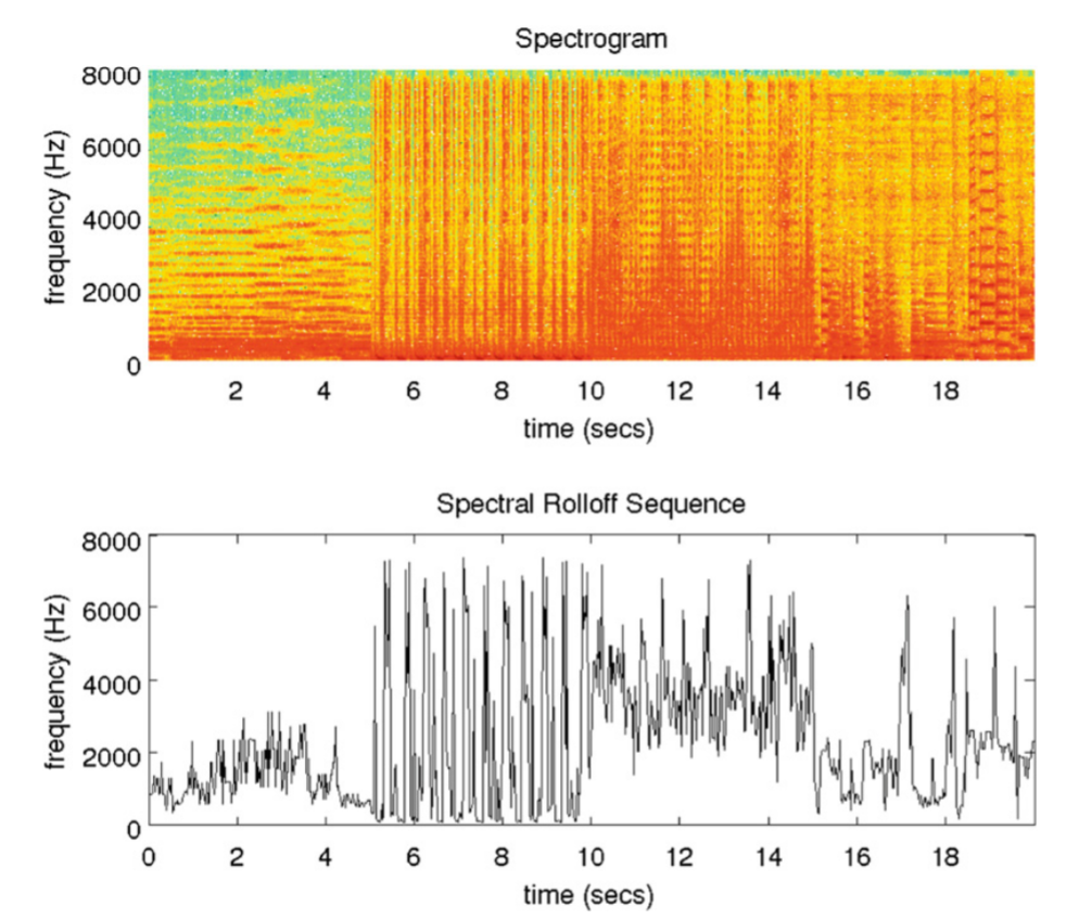 Spectral rolloff cũng có thể được coi là một mô tả hình dạng phổ của tín hiệu âm thanh và có thể được sử dụng để phân biệt giữa âm thanh tiếng nói và âm thanh không phải tiếng nói. Nó cũng có thể được sử dụng để phân biệt giữa các loại nhạc khác nhau. Hình dưới trình bày một ví dụ về spectral rolloff. Hình này được trích xuất từ một bản nhạc tổng hợp (dài 20 giây) bao gồm bốn đoạn trích nhạc khác nhau (mỗi đoạn 5 giây). Phần đầu tiên của bản nhạc tổng hợp bắt nguồn từ âm nhạc cổ điển, phần thứ hai và thứ ba bắt nguồn từ hai bản nhạc điện tử khác nhau, trong khi phần cuối cùng đến từ một bản nhạc jazz. Có thể dễ dàng quan sát thấy rằng các bản nhạc điện tử tương ứng với các giá trị cao hơn của chuỗi spectral rolloff. Ngoài ra, sự biến đổi cũng rõ ràng hơn đối với loại nhạc này. Đó là một điều dễ hiểu nếu chúng ta xem xét hình dạng của các phổ tương ứng: trong các phần cổ điển và jazz, phần lớn năng lượng quang phổ tập trung ở tần số thấp hơn và chỉ có thể nhìn thấy một số sóng điều hòa ở vùng tần số trung và cao hơn. Mặt khác, trong ví dụ này, âm nhạc điện tử mang lại phổ rộng hơn và do đó các giá trị spectral rolloff tương ứng cao hơn.