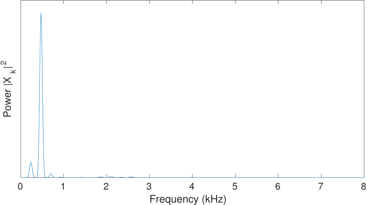 Đối với các đầu vào có giá trị thực, các thành phần tần số dương và âm là các liên hợp phức (complex conjugates) của nhau, sao cho chúng giữ lại N đơn vị thông tin duy nhất. Vì spectrum là các vectơ là số phức, ta sẽ visualize magnitude hoặc power của nó. Với tín hiệu đầu vào như bên dưới: