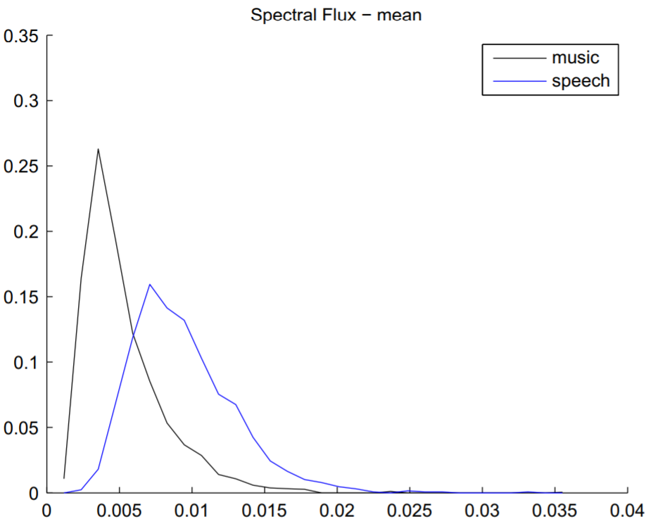 là hệ số DFT đã chuẩn hóa thứ của frame thứ . Hình dưới trình bày biểu đồ giá trị trung bình của chuỗi spectral flux của các frame từ hai class: music và speech. Có thể thấy rằng các giá trị của spectral flux của speech cao hơn so với music. Điều này là do sự thay đổi phổ cục bộ xảy ra thường xuyên hơn trong các tín hiệu lời nói do sự thay đổi nhanh chóng giữa các âm vị.