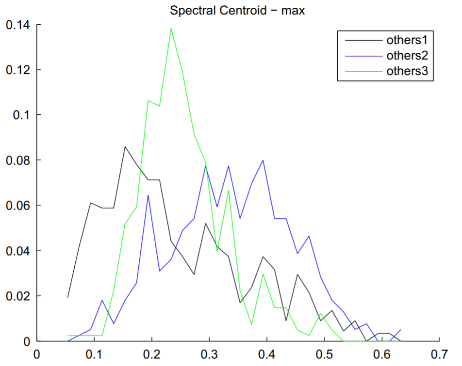 Với spectral centroid, ta có thể thấy rằng các giá trị cao tương ứng với âm thanh sáng hơn. Hình bên dưới là biểu đồ giá trị tối đa của tâm phổ cho các frame âm thanh từ ba loại âm thanh môi trường. Có thể thấy rằng class ‘other1’ - chủ yếu bao gồm tiếng ồn nền và khoảng lặng…, thể hiện các giá trị thấp hơn ở vùng giá trị thấp, trong khi các giá trị cao ở các class 'other3' thể hiện âm thanh biến đổi đột ngột.