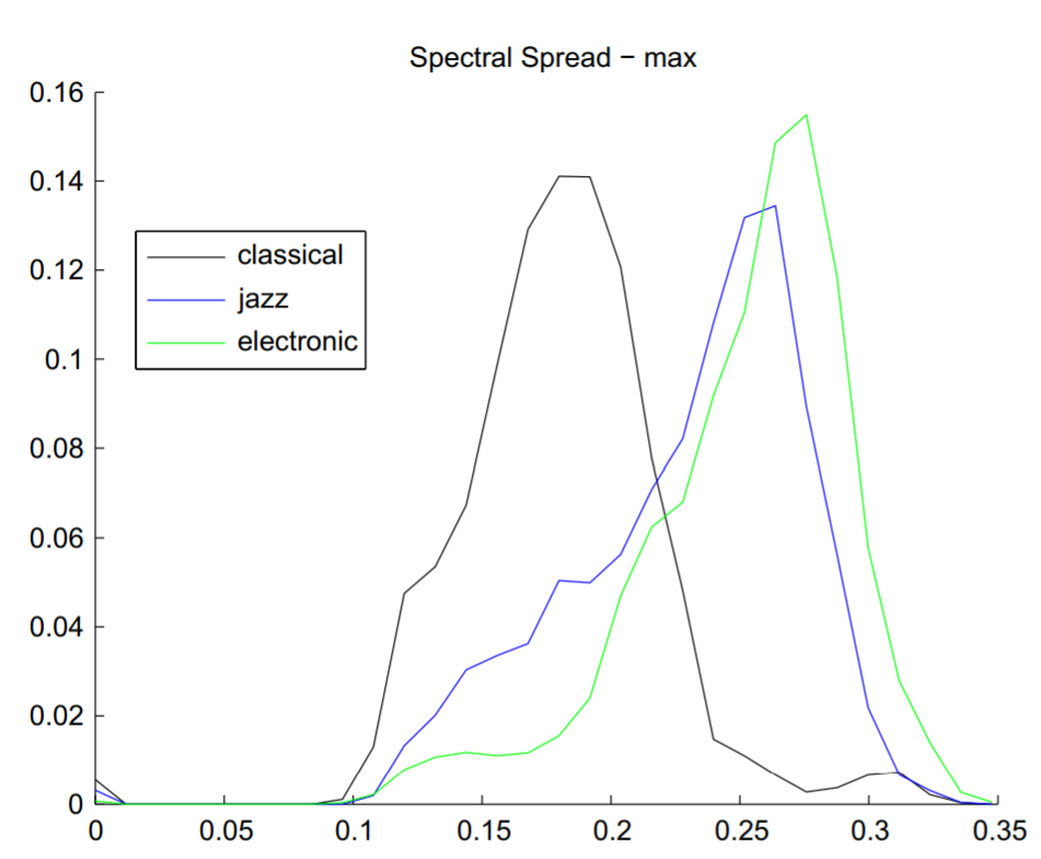 Như vậy, các giá trị thấp của Spectral spread tương ứng với các tín hiệu có phổ tập trung dày đặc quanh tâm quang phổ. Hình bên dưới thể hiện biểu đồ giá trị tối đa của chuỗi Spectral spread cho các frame âm thanh xuất phát từ ba class âm nhạc (classical, jazz và electronic). Trong ví dụ cụ thể này, kết quả cho thấy phổ của các trích đoạn của nhạc điện tử (thường) được lan truyền rộng rãi hơn ra quanh tâm của nó so với nhạc cổ điển và nhạc jazz. Tuy nhiên kết quả này có thể sẽ không giống nhau cho mọi bản nhạc trong các thể loại.