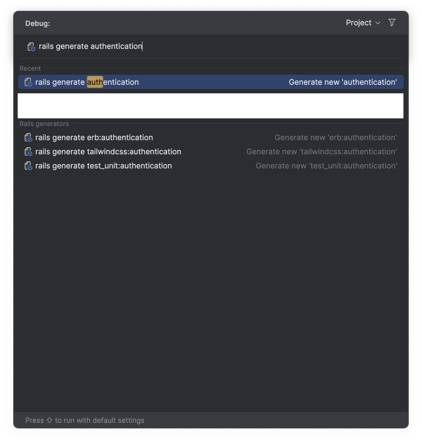 Hoặc ở RubyMine, mình sẽ bật cửa sổ lệnh lên và gõ tìm kiếm rồi click