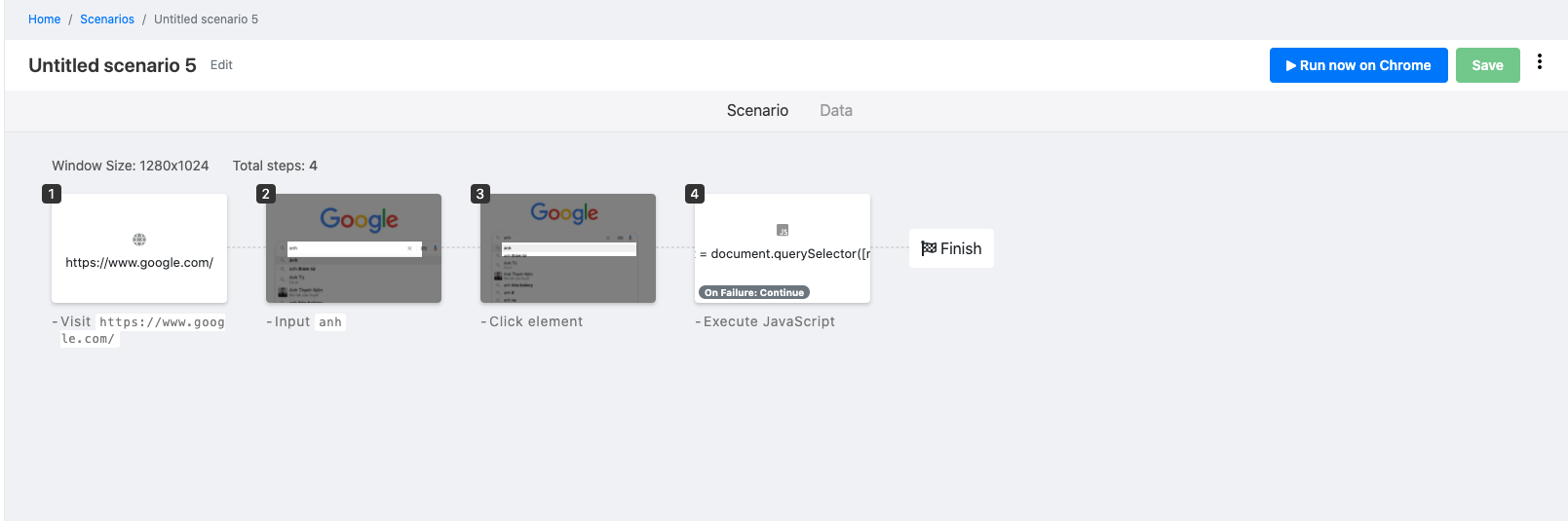 Dưới đây là các kịch bản đã được ghi lại bằng Autify Recorder, bạn có thể chỉnh sửa hoặc xoá các bước đã có, thêm các bước mới.