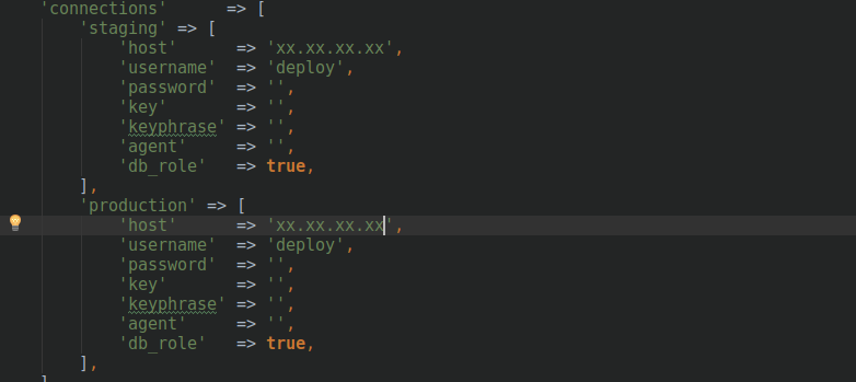 Mở file config.php, đây là file config thông tin server, và môi trường staging hay production. Chúng ta đơn giản chỉ cần điền IP server, user sẽ thực hiện deploy, ở đây mình đặt là user deploy