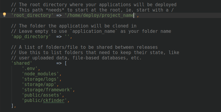 Tiếp theo là file remote.php - File này chứa config đường dẫn thư mục dự án sẽ deploy trên server và những file hay folder mà chúng ta muốn cache lại sau mỗi quá trình deploy, ví dụ folder vendor, node_modules ...