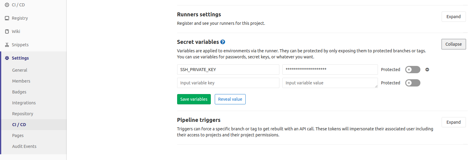 gitlabhồi nãy. - Vào trong respository của trên GitLab chọn: Settings > CI/CD: Trong trang mới, chọn Secret variables để tạo biến lưu private key với tên biến là