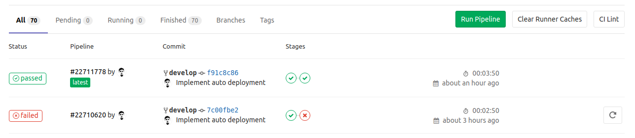 Danh sách pipeline trên GitLab sẽ hiển thị như ảnh dưới, toàn bộ stage xanh tức là toàn bộ đều success, x đỏ là stage đó chứa job bị failed: