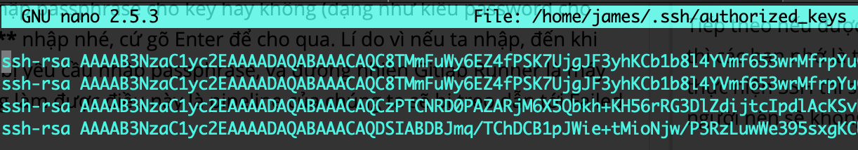 Sau đó ta copy nội dung file Public Key ở local và thêm vào ở dòng mới ở cuối cùng của file authorized_keys. Ví dụ của mình nom sẽ như sau: