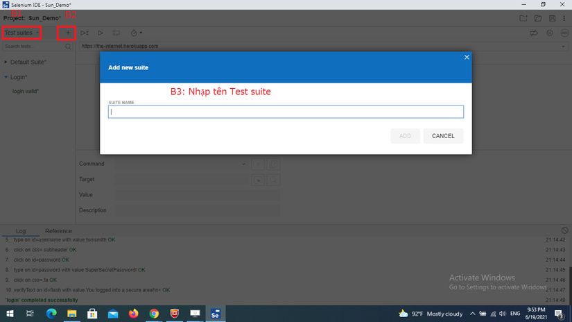 Tương tự như B3 ở phần 1, bạn tạo 1 test case nữa tên là login invalid . Sau đó ta tạo Test suit như sau