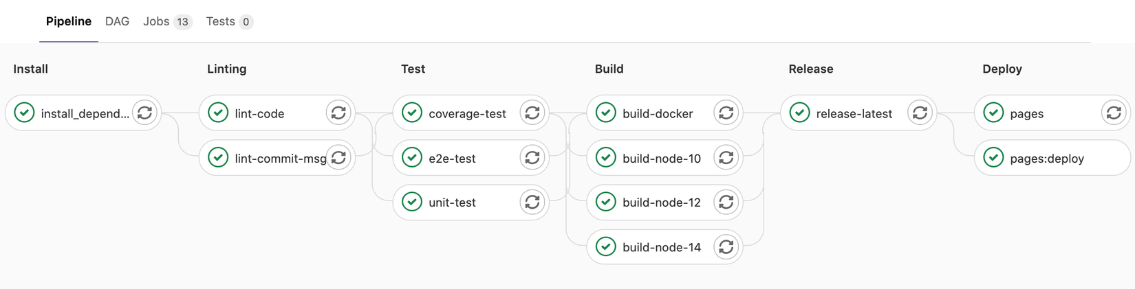 Vậy là đến cuối bài ta đã có 1 pipeline cũng khá là xịn xò rồi nhỉ. Qua đây chúng ta có thể thấy được những điều tuyệt vời ta có thể làm khi áp dụng CICD vào project để tự động hoá những thao tác lặp đi lặp lại, tiết kiệm thời gian, ta chỉ cần commit, mọi thứ còn lại từ lint, test, build release,... Gitlab lo hết 😘. Ví dụ như bên dưới là 1 pipeline trong project thật của mình 😎