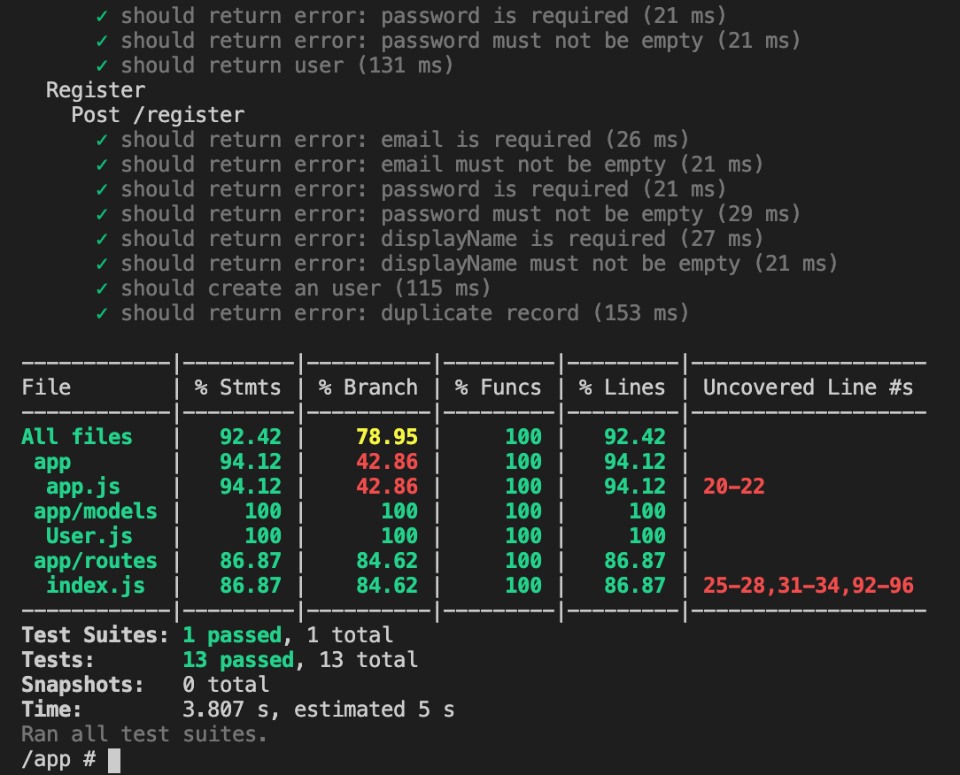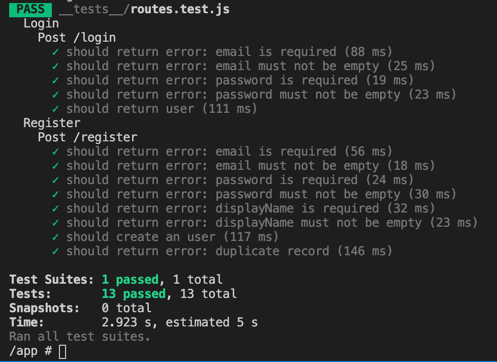 Các bạn mở file __tests__/routes.test.jssẽ thấy trong đó mình test 2 route là Login và Register, với mỗi route mình test một số trường hợp cơ bản. Ví dụ với Register thì test khi user nhập thiếu email có trả về đúng hay không, password rỗng thì kết quả trả về có đúng mong đợi hay không,.... Cái tên nói lên tất cả, mỗi test đều rất cơ bản luôn các bạn tự sướng phần này nhé 😉 (nếu có gì thắc mắc comment cho mình biết nhé)