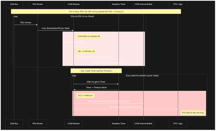 Dưới đây là sơ đồ mô tả mối quan hệ giữa 3 sự kiện: Nhận PDU (Com_RxIndication), Xử lý Timeout (ComTimeout), và Application đọc dữ liệu (Com_ReceiveSignal/Rte_Read).