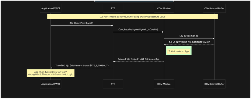 o Application có thể nhận biết Timeout thông qua việc kiểm tra trạng thái trả về của API (nếu dùng Rte_Receive) hoặc cờ trạng thái (Status Flag) nếu được thiết kế, hoặc đơn giản là nhận được giá trị Init/Substitute mà không hay biết đó là do Timeout (nếu dùng Rte_Readthông thường)