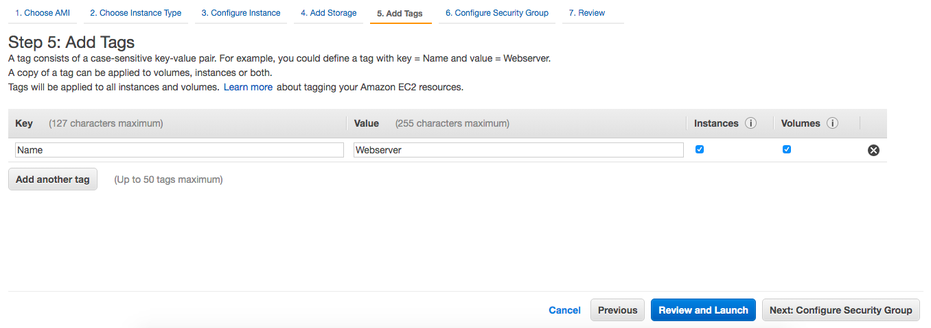 - Step 5: Add Tags -> Ở bước này, mình add tag với key = Name và Value = Webserver.