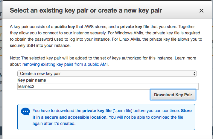 - Step 8: Download keypair -> Đặt tên file cho keypair và click download (file này sẽ dùng để thực hiện ssh vào EC2 này)