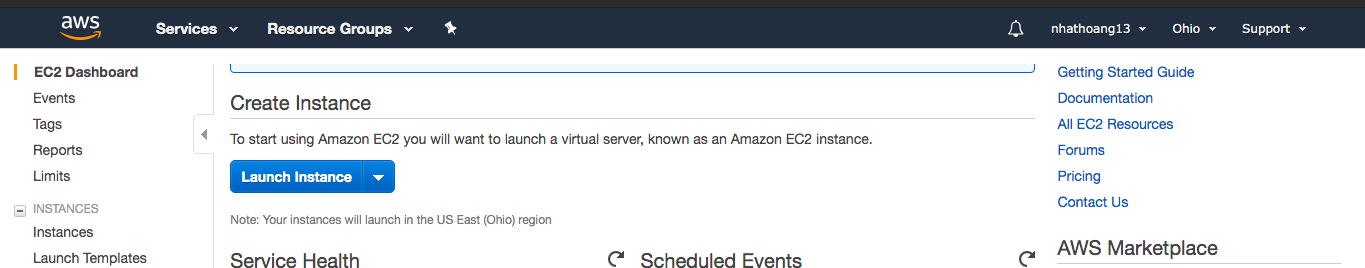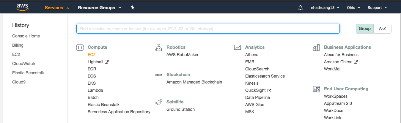 - Sau khi login vào tài khoản AWS, ở thanh điều hướng, lựa chọn phần Services, rồi chọn EC2