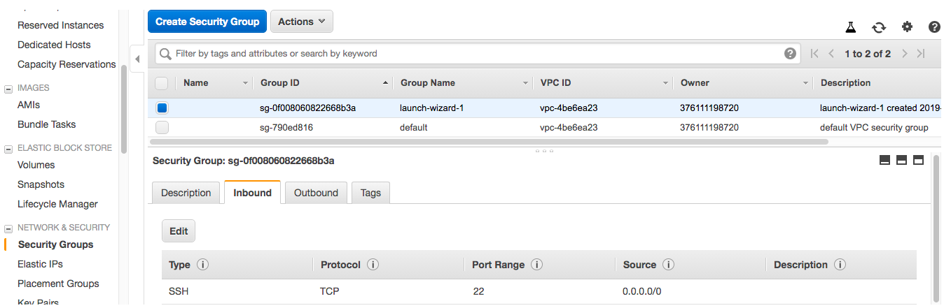 Ở màn hình console AWS, chọn vào Security Group của phần NetWork & Security. Sau đó chọn vào tab Inbound và chọn Edit