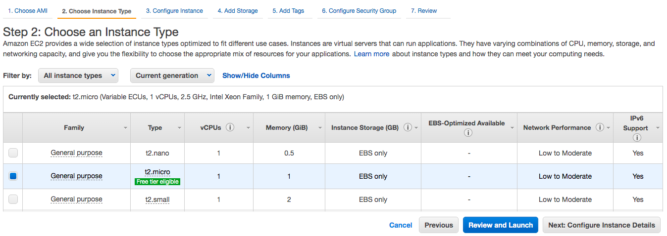 - Step 2: Choose an Instance Type -> Lựa chọn type của Instance, ở đây mình sẽ lựa chọn type nào nằm trong Free-Tier là được.