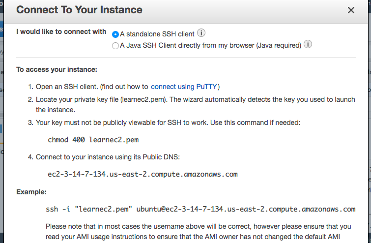 - Connect vào EC2 Ở màn hình view instance, click vào button Connect, sẽ có 1 cửa sổ hướng dẫn ssh vào server rất cụ thể