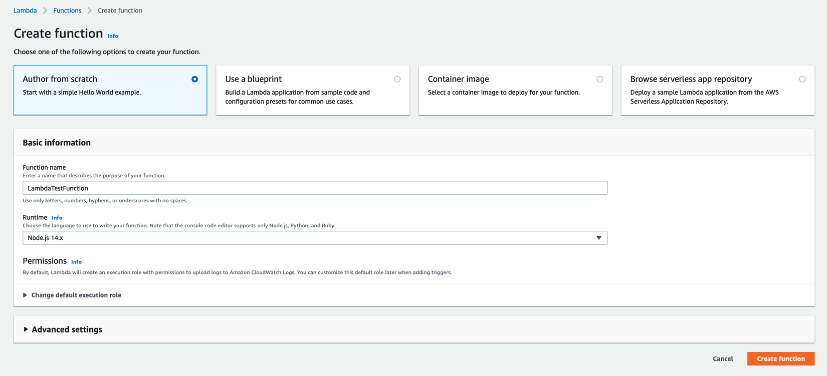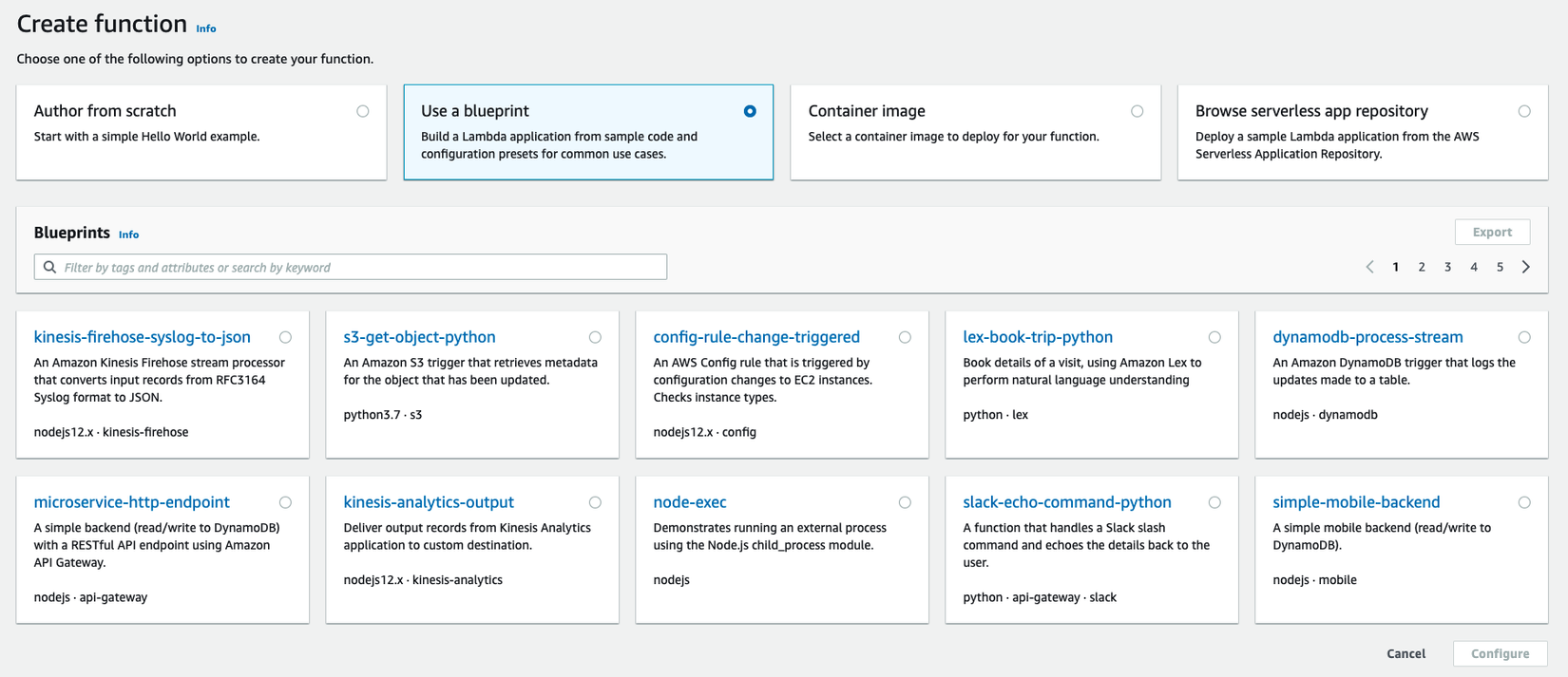 2.1.1 Chúng ta có thể tiến hành lựa chọn một Lambda "blueprint" phù hợp hoặc tự config từ mục "Author from scratch"