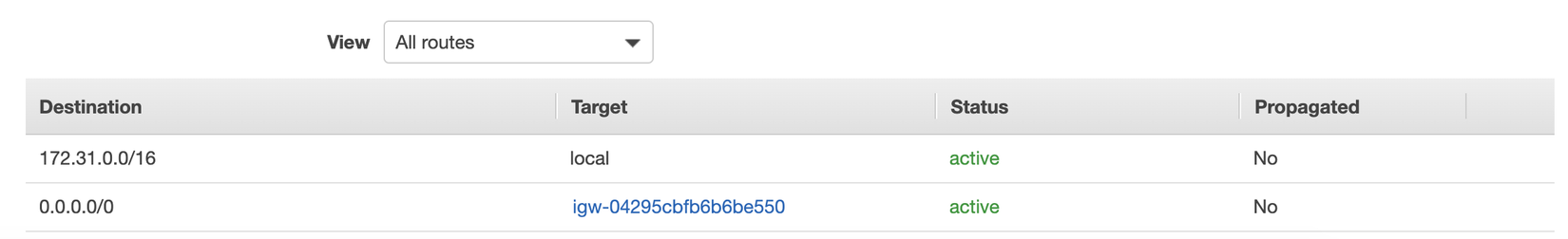 Một route local: Biểu thị cho việc các communication với IP address nằm trong dải IP CIDR range là 172.31.0.0/16 dưới đây thì các communication đó sẽ keep là communication local trong VPC