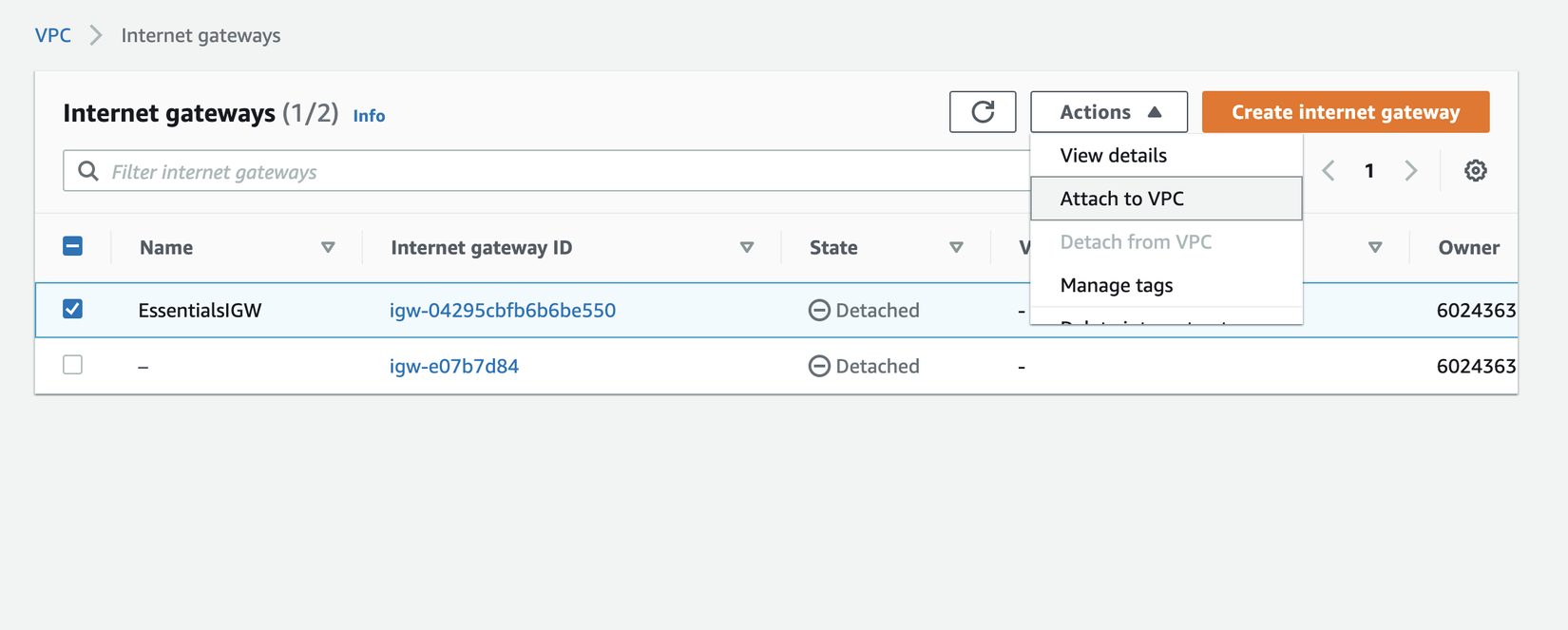 Note: Default VPC sẽ đều có Internet Gateway với trạng thái attached