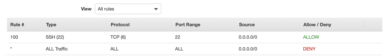 Ví dụ chúng ta tạo ra một rule giống hệt với RULE 100 là RULE 90 nhưng thay vì ALLOW thì setting là DENY cho type SSH và Protocal TCP. thì bởi vì rule 90 đứng trước rule 100 vậy nên cơ bản sẽ DENY toàn bộ kết nối type SSH và protocal TCP tới Subnets và bởi đã tìm thấy matching rule nên sẽ không chạy qua rule 100 tiếp Cơ bản thì rule 90 và 100 là trái ngược với nhau, tuy nhiên thì vẫn có thể setting được như vậy do logic xử lý từ trên xuống dưới của AWS.