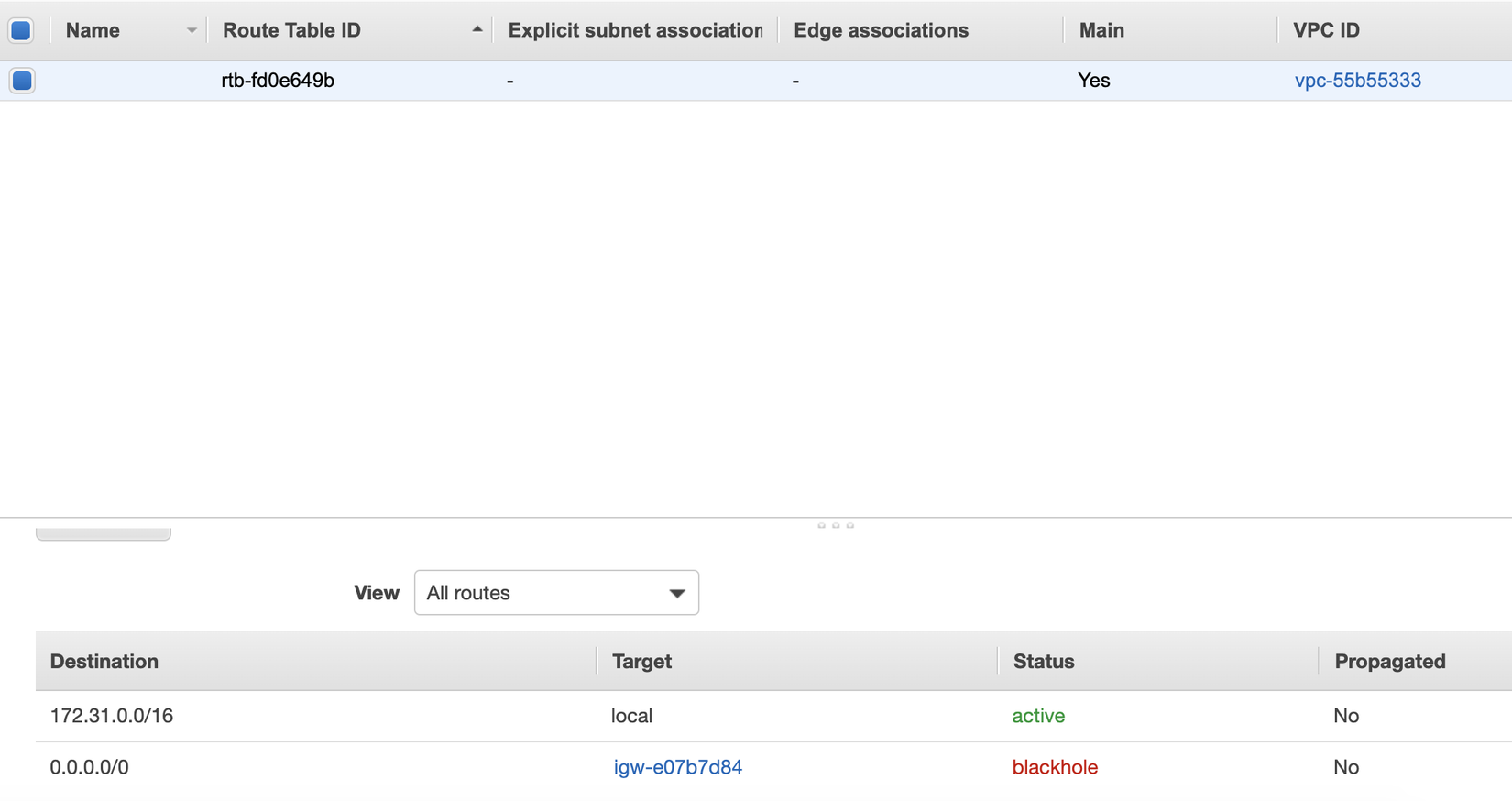 Một route connect tới IGW (dưới đây là trạng thái blackhold do ở step trước chúng ta đã dettached kết nối IGW default tới VPC và thay bằng một IGW mới) Route connect tiếp theo với destination là 0.0.0.0/0: Biểu thị rằng bất kì kết nối nào không được chỉ định kết nối tới local subnet thì sẽ được trỏ default tới kết nối này (chính là Internet Gateway) và sẽ communicate với Internet (nếu trạng thái là active, trạng thái blackhole sẽ không connect được tới internet) thay vì chỉ communicate nội bộ trong VPC.