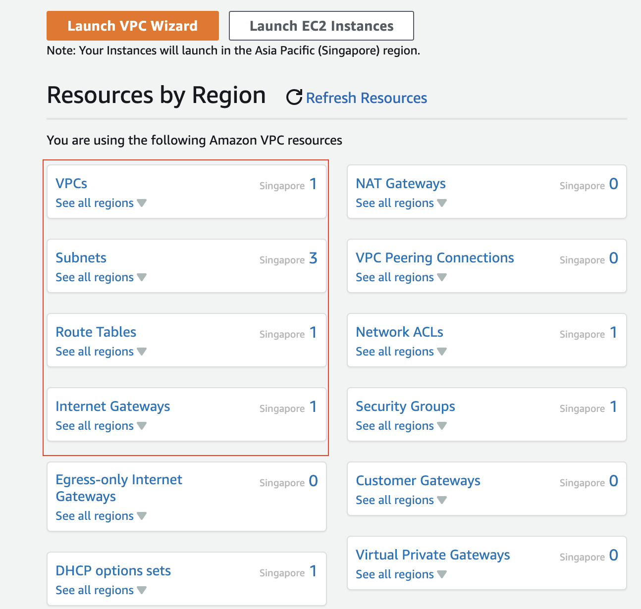 Có thể thấy dưới đây, các thành phần cơ bản trên VPC đều đã được khởi tạo trước khi tạo Account AWS: