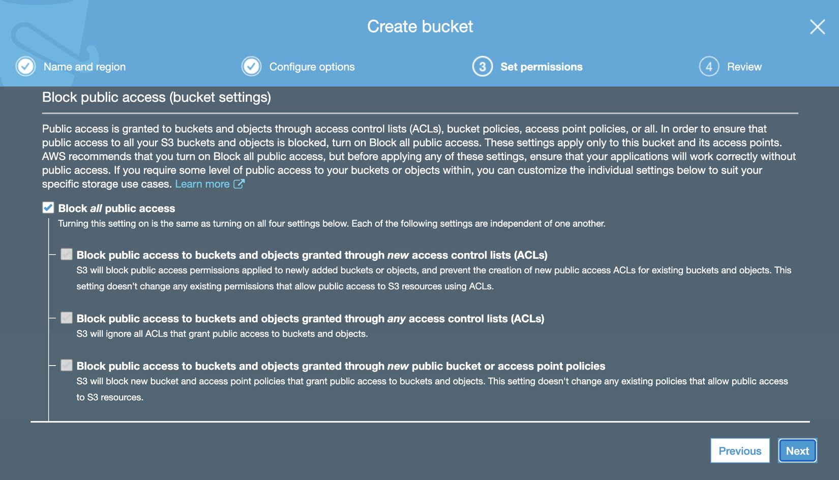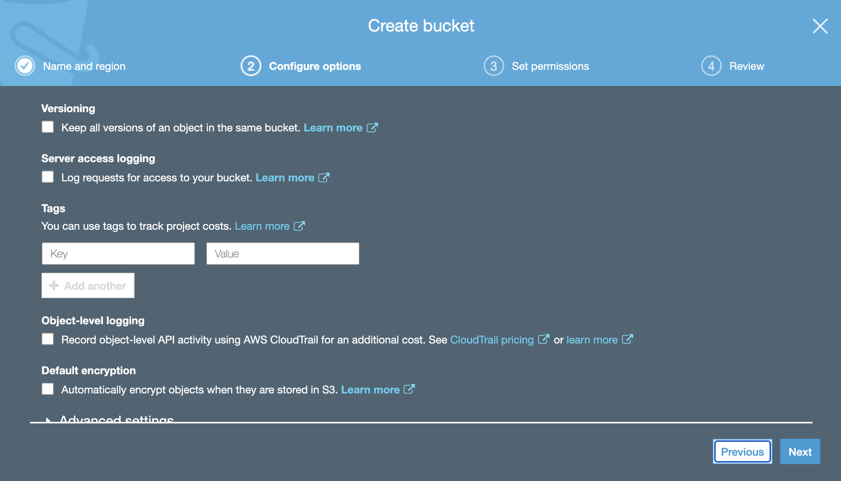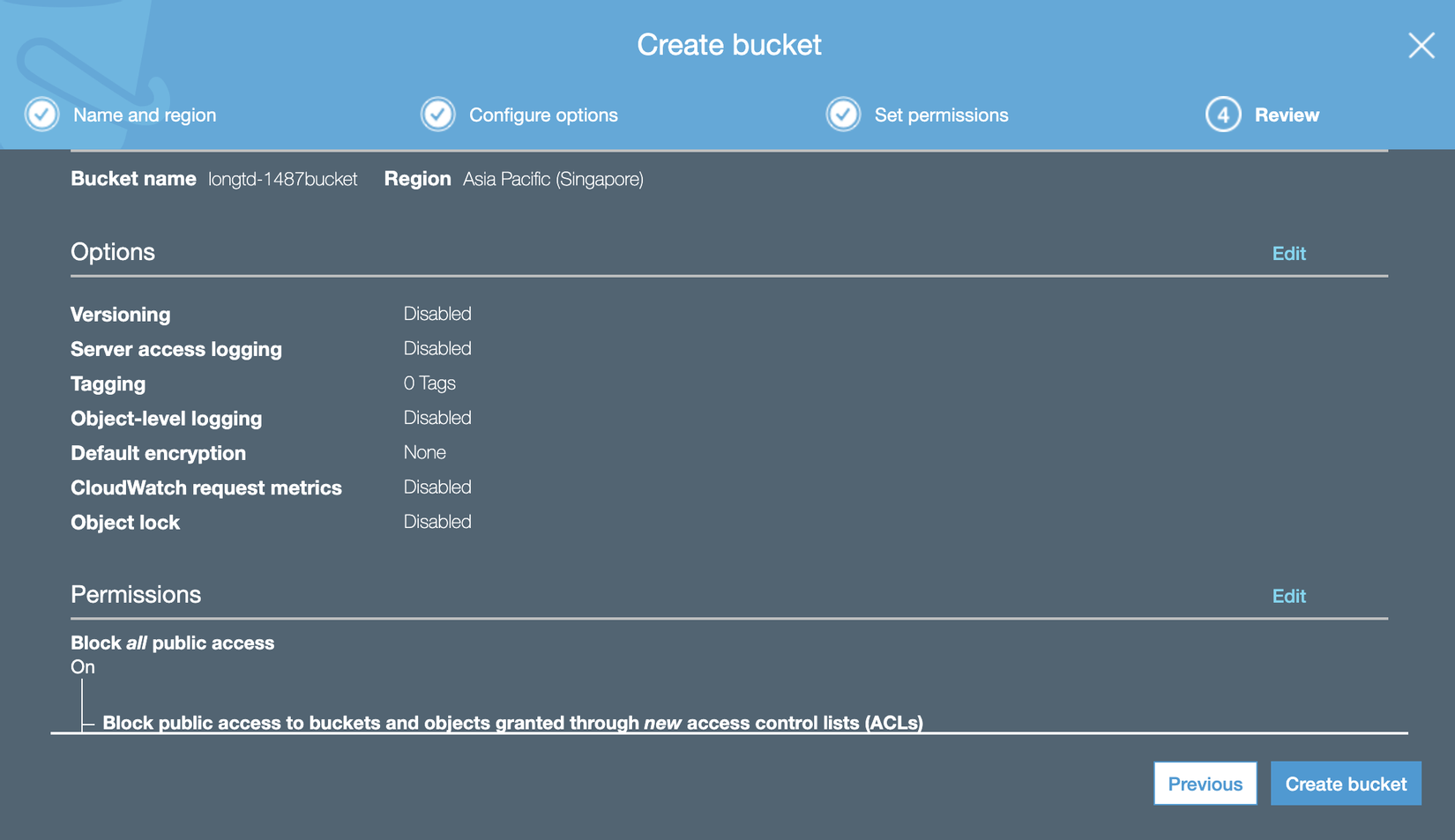 Tạm thời chúng ta sẽ set phần này ở default và sẽ đi sâu tìm hiểu những mục setting advance này sau và sẽ tiến hành thực hiện tạo 1 S3 Bucket
