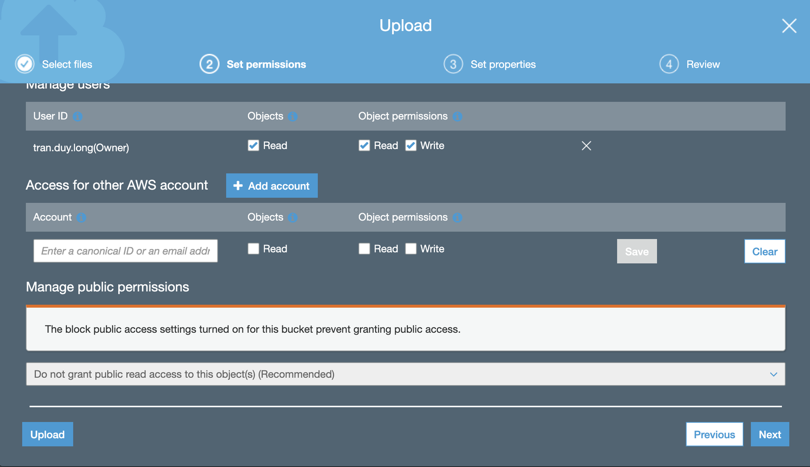 - Chúng ta có thể tiến hành set quyền Read/Write cho từng account AWS khác. Setting này nhằm hạn chế quyền truy cập của các user tới resource lưu trữ trên S3