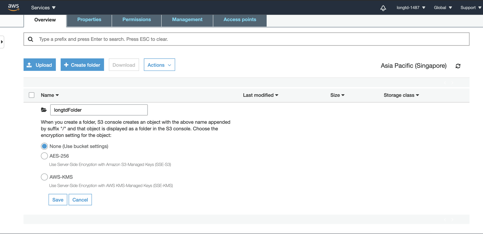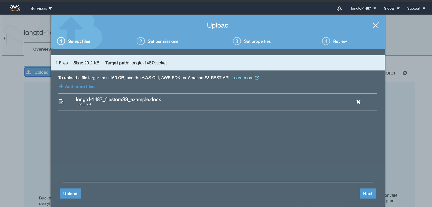 - Sau khi khởi tạo 1 S3 bucket thành công, chúng ta có thể tiến hành upload file bất kì lên folder S3 (text, video, image,...)