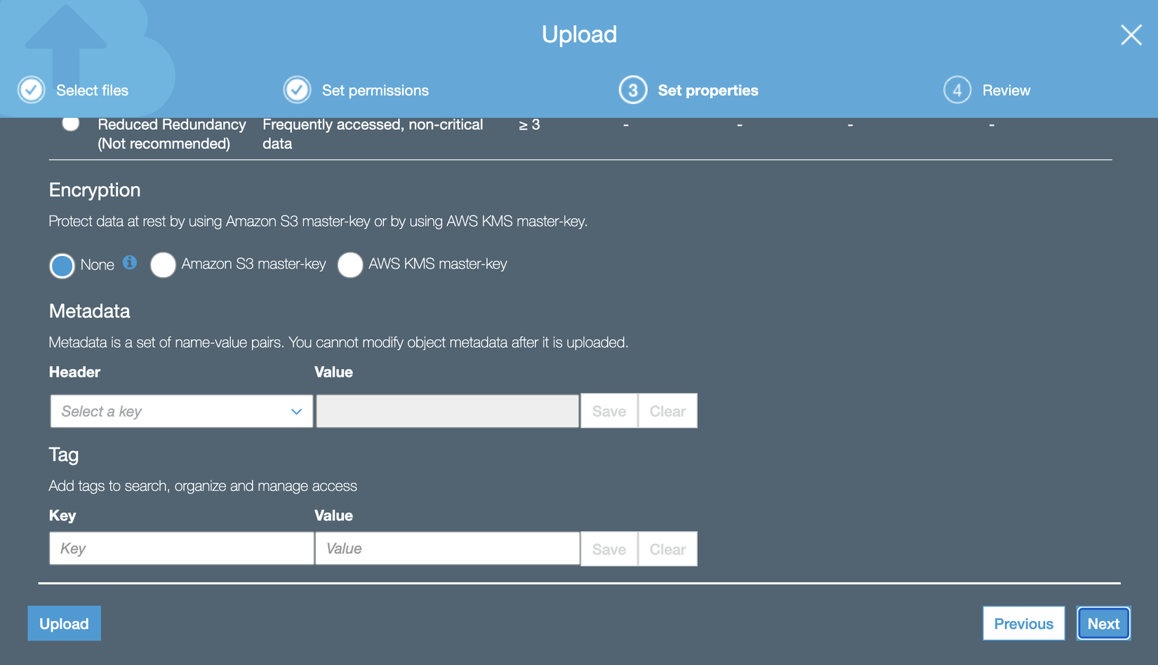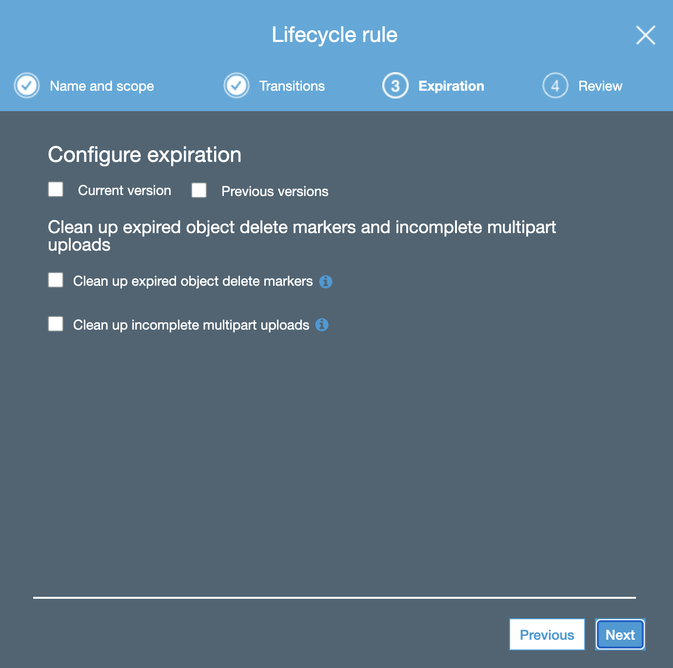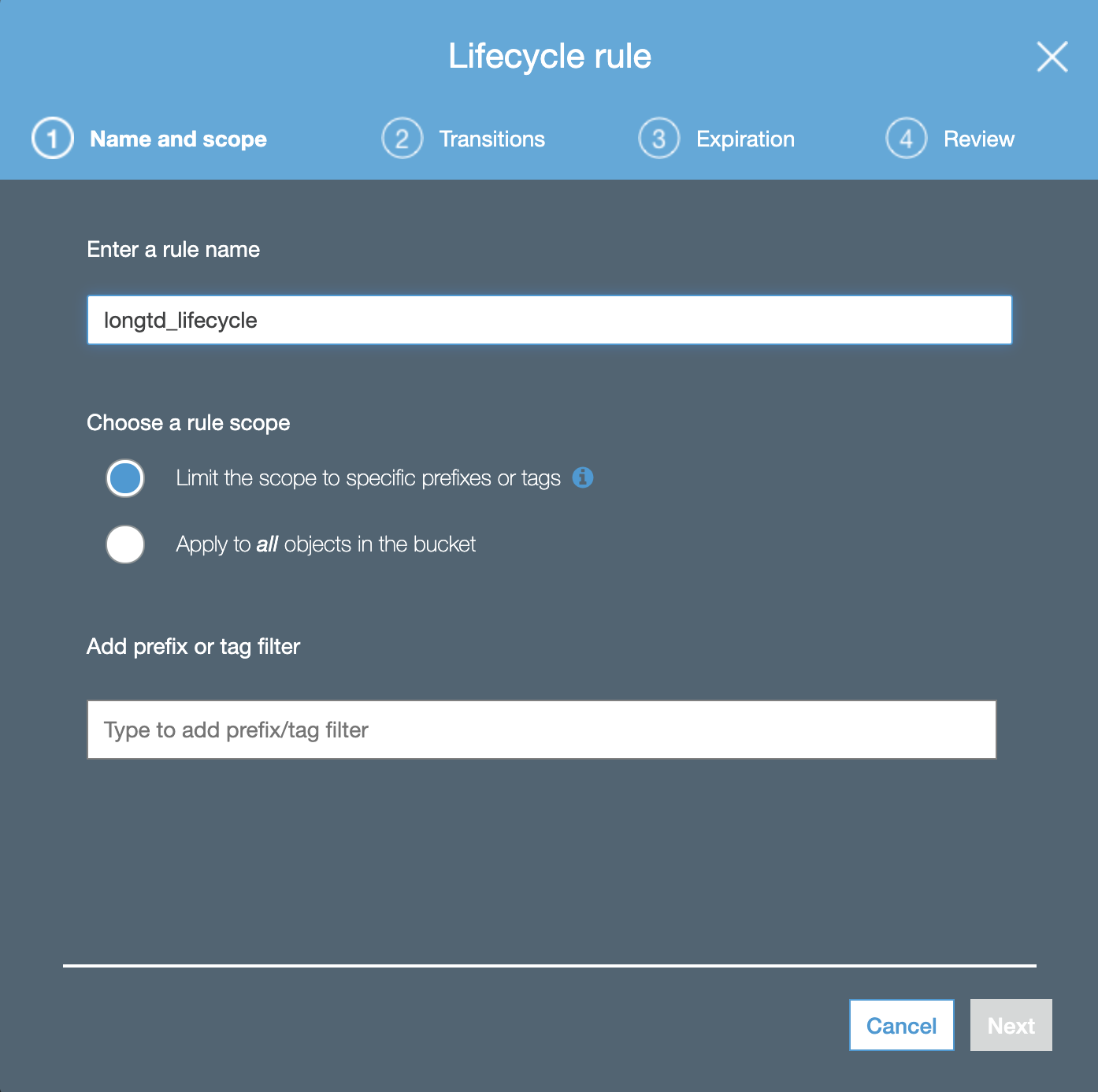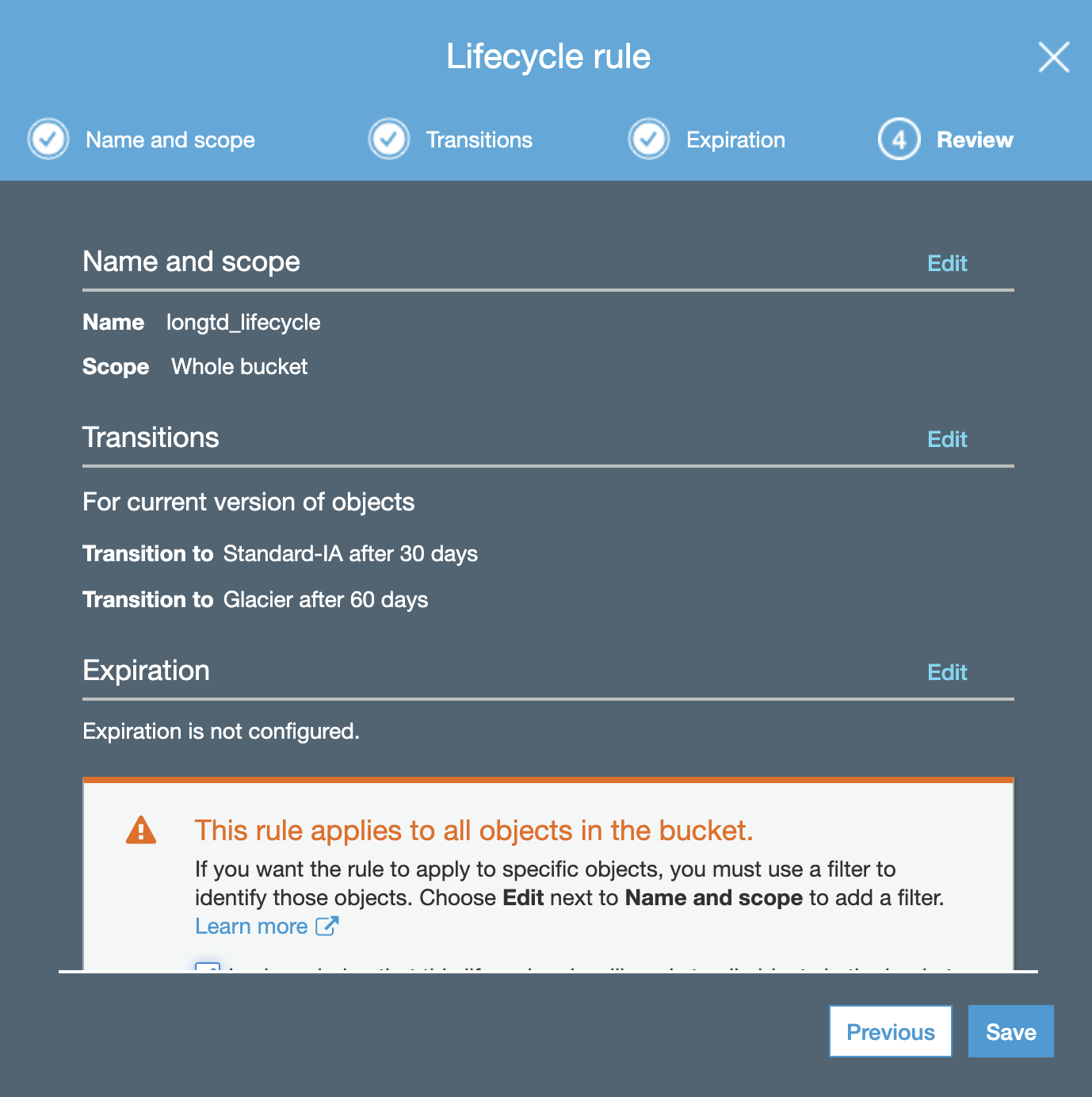 - Settings này cho phép chúng ta giới hạn thời gian lưu trữ của file trên S3 Bucket (30 ngày, 90 ngày ,... ), dung lượng của file cũng như mã hóa bảo về data bằng việc sử dụng Amazone master-key