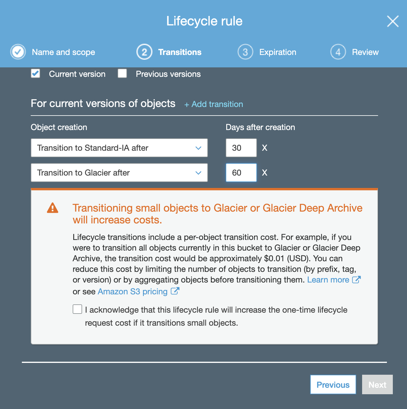 - Ở tab Transition chúng ta sẽ tiến hành setting theo như Solution nói trên: Lưu ý: Việc transition object nhỏ sang Storage class Glacier sẽ phát sinh chi phí