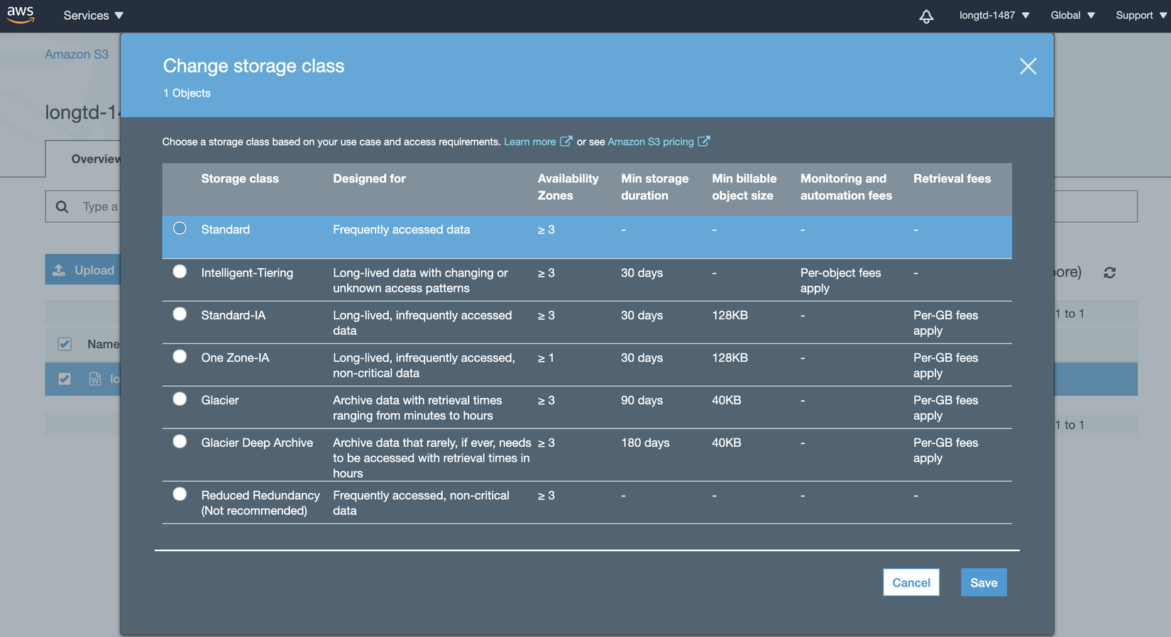 - Storage class thích hợp nhất: Storage class = Standard Infrequent Access