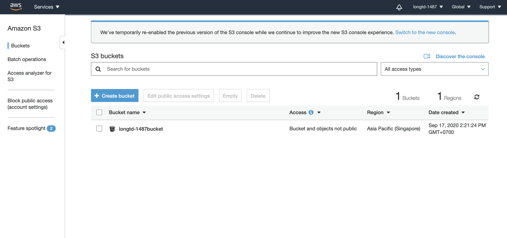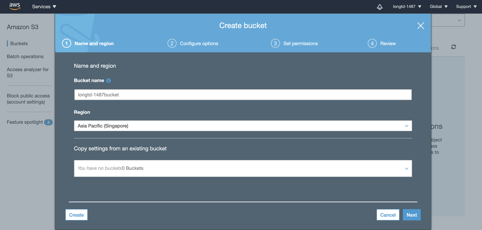 - Khi tạo một bucket, chúng ta phải chọn một region cụ thể để dựng S3 trên region đó. Điều này có nghĩa là bất kì data chúng ta upload lên S3 bucket thì sẽ được store trên data center của region tương ứng chúng ta đã chọn.